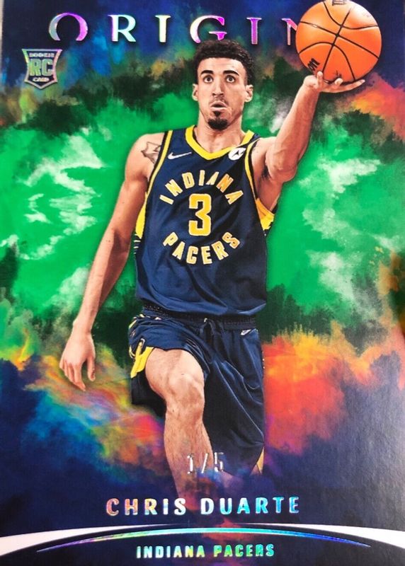 This card is 1 of 12 Chris Duarte's card variations in the 2021 Origins set being tracked by Sports Card Investor, including Base, Red, Blue /99, Orange /75, and Pink /60.