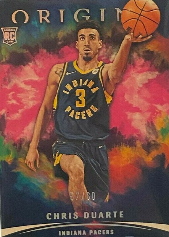 This card is 1 of 12 Chris Duarte's card variations in the 2021 Origins set being tracked by Sports Card Investor, including Base, Red, Blue /99, Orange /75, and Turquoise /25.
