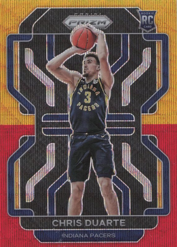 The Chris Duarte 2021 Prizm #315 Red & Gold Wave Rookie card in Raw condition has not changed in price in the last 30 days and was last sold for $6.00 .