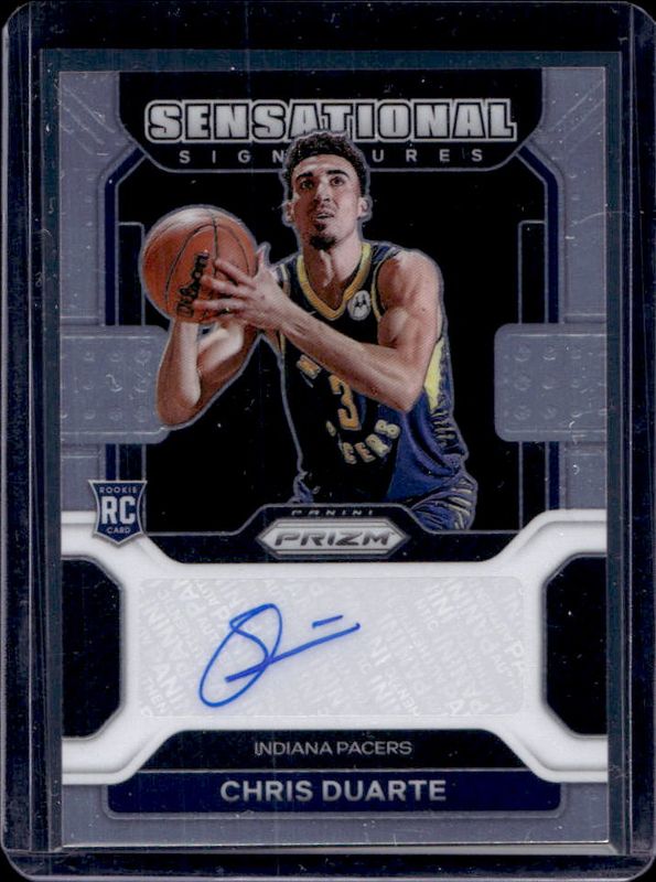 The Chris Duarte 2021 Prizm #SS-CDU Sensational Signatures Rookie card is 1 of 103 Chris Duarte's card variations in the 2021 Prizm set being tracked by Sports Card Investor, including #315b Base, #315 Base, #315 Photo Variation, #315 Blue NBA 75th Anniversary, and #315 Blue Wave.