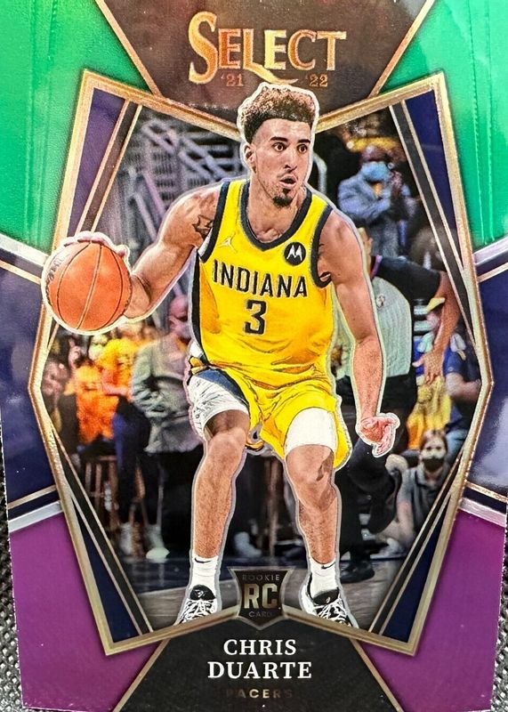 The Chris Duarte 2021 Select #146 Premier Level Green White Purple Rookie card in Raw condition has not changed in price in the last 30 days and was last sold for $2.02 .