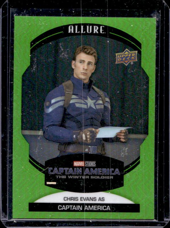 The Chris Evans 2022 Upper Deck Marvel Allure #26 Green Quartz /99 card is 1 of 102 Chris Evans' card variations in the 2022 Upper Deck Marvel Allure set being tracked by Sports Card Investor, including #126 Base, #26 Base, #104 Base, #50 Base, and #92 Base.