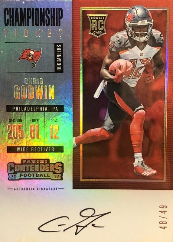 The Chris Godwin 2017 Contenders #337 Rookie Ticket Auto - Championship Ticket (/49) card in Raw condition has not changed in price in the last 30 days and was last sold for $39.99 .