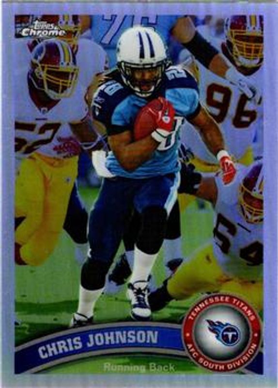 The Chris Johnson (RB) 2011 Topps Chrome #30 Refractor card is 1 of 16 Chris Johnson (RB)'s card variations in the 2011 Topps Chrome set being tracked by Sports Card Investor, including Base, Orange Refractor, X-Fractor, Purple Refractor /499, and Black Refractor /299.