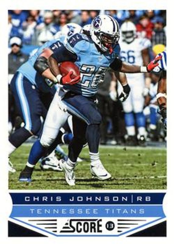 The Chris Johnson (RB) 2013 Score #211 Base card is 1 of 27 Chris Johnson (RB)'s card variations in the 2013 Score set being tracked by Sports Card Investor, including #297 Base, #297 Scorecard, #211 Scorecard, #297 Showcase /99, and #211 Showcase /99.