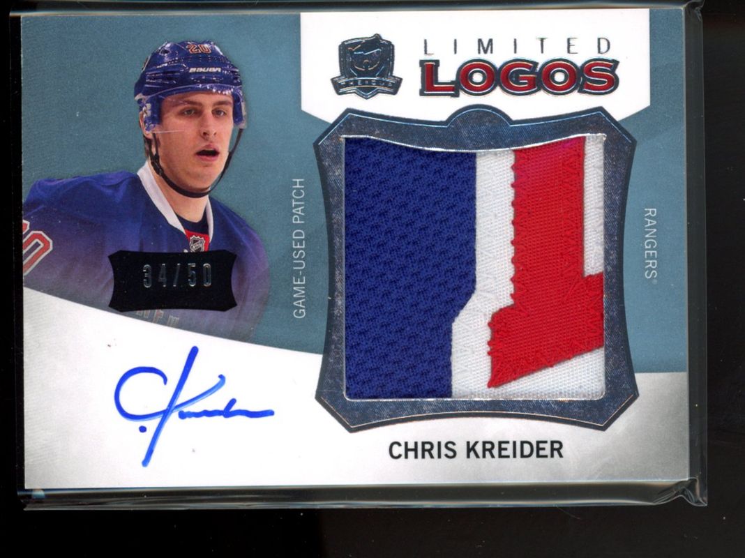 The Chris Kreider 2012 Upper Deck The Cup #LL-CK Limited Logos Autographs /50 Rookie card is 1 of 71 Chris Kreider's card variations in the 2012 Upper Deck The Cup set being tracked by Sports Card Investor, including Base /249, Gold /25, Gold Rainbow /10, Black /1, and Black Laundry Tags /1.