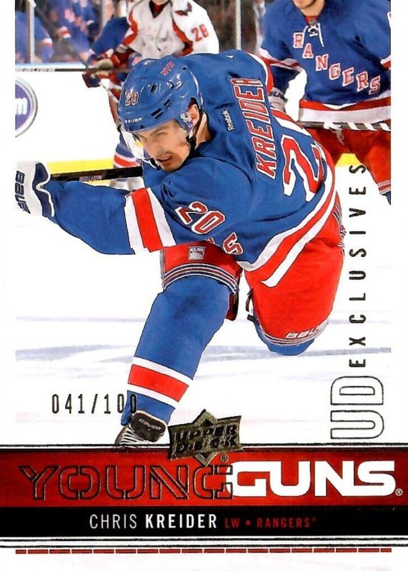 The Chris Kreider 2012 Upper Deck #237 Young Guns - UD Exclusives /100 Rookie card in Raw condition has not changed in price in the last 30 days and was last sold for $97.73 .