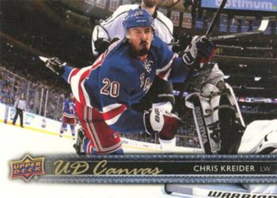 The Chris Kreider 2014 Upper Deck #C59 UD Canvas card is 1 of 11 Chris Kreider's card variations in the 2014 Upper Deck set being tracked by Sports Card Investor, including Base, UD Exclusives /100, UD High Gloss /10, Printing Plates Black /1, and Printing Plates Cyan /1.
