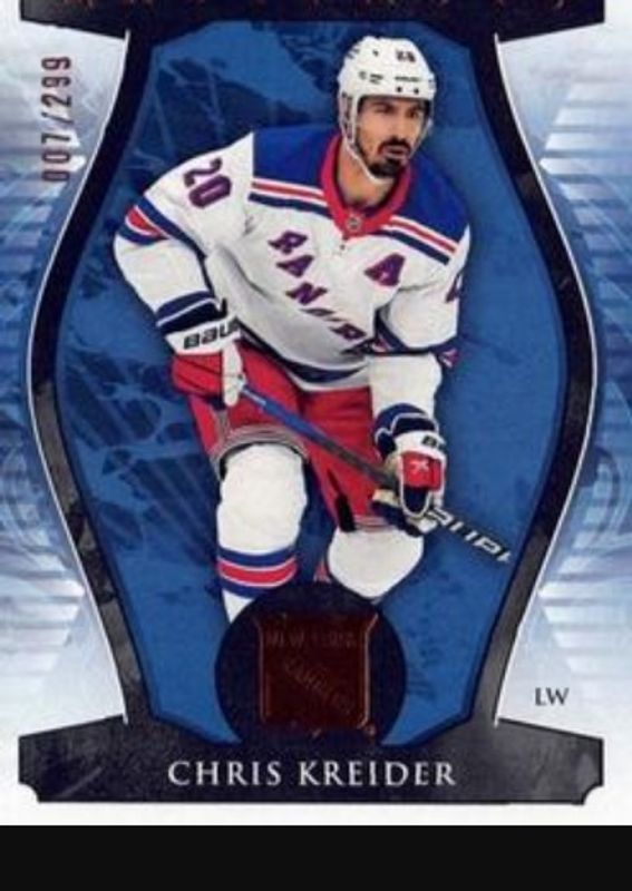 The Chris Kreider 2023 Upper Deck Artifacts #97 Copper /299 card is 1 of 20 Chris Kreider's card variations in the 2023 Upper Deck Artifacts set being tracked by Sports Card Investor, including Base /999, Turquoise, Ruby /499, Royal Blue /199, and Emerald /99.