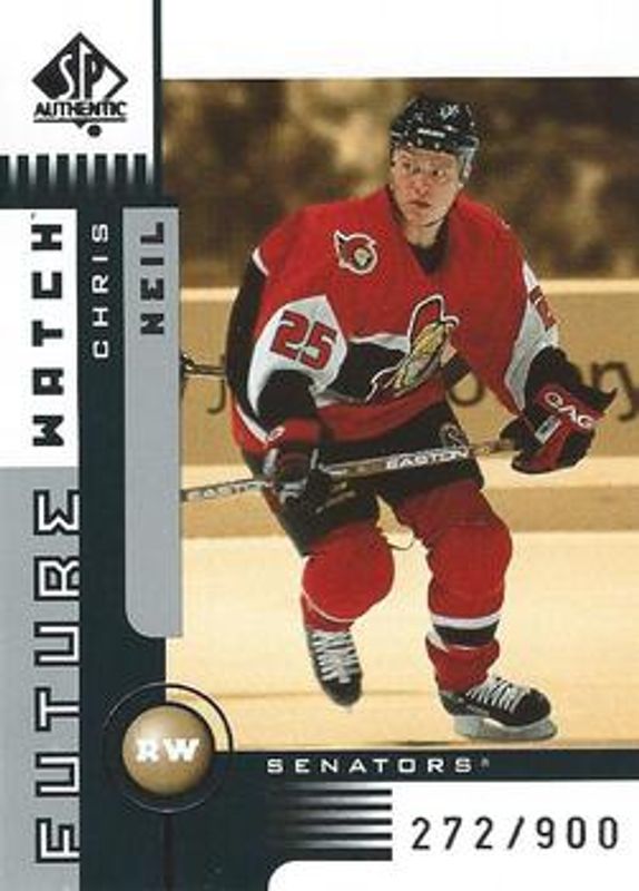 The Chris Neil 2001 SP Authentic #166 Future Watch /3500 Rookie card is 1 of 3 Chris Neil's card variations in the 2001 SP Authentic set being tracked by Sports Card Investor, including Limited /150, and Limited Gold /25.