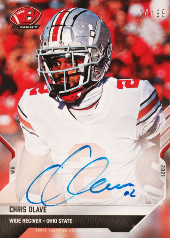 This card is 1 of 7 Chris Olave's card variations in the 2021 Bowman Next set being tracked by Sports Card Investor, including Base (Print Run: 889), Autographs - Blue /49, Autographs - Purple /25, Autographs - Red /10, and Autographs - Orange /5.