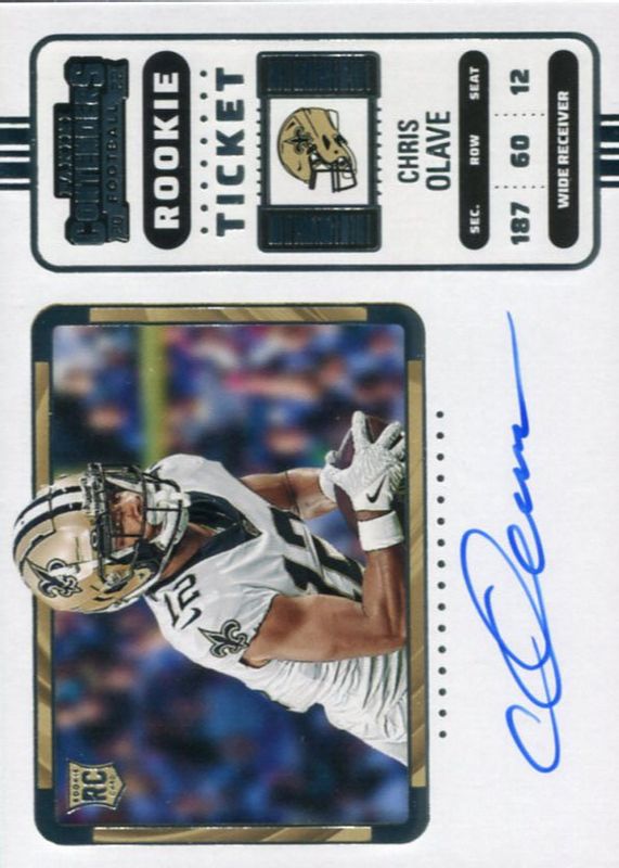 This card is 1 of 31 Chris Olave's card variations in the 2022 Contenders set being tracked by Sports Card Investor, including Rookie Ticket Auto, Rookie Ticket Auto - Red Zone Ticket, Rookie Ticket Auto - Silver (/49), Rookie Ticket Auto - Ticket Stub (/12), and Rookie Ticket Auto - Wild Card.