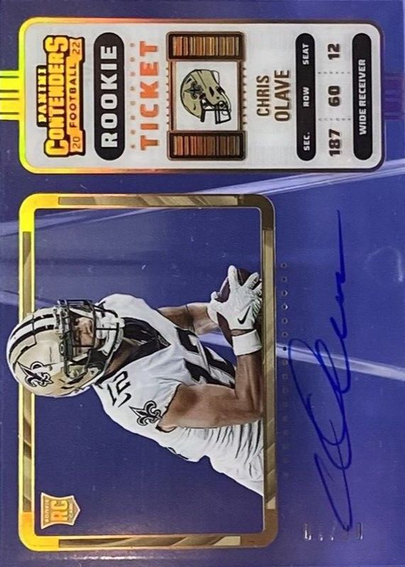 This card is 1 of 31 Chris Olave's card variations in the 2022 Contenders set being tracked by Sports Card Investor, including Rookie Ticket Auto, Rookie Ticket Auto - Red Zone Ticket, Rookie Ticket Auto - Silver (/49), Rookie Ticket Auto - Ticket Stub (/12), and Rookie Ticket Auto - Wild Card.