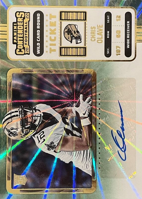 This card is 1 of 31 Chris Olave's card variations in the 2022 Contenders set being tracked by Sports Card Investor, including Rookie Ticket Auto, Rookie Ticket Auto - Red Zone Ticket, Rookie Ticket Auto - Silver (/49), Rookie Ticket Auto - Ticket Stub (/12), and Rookie Ticket Auto - Wild Card.