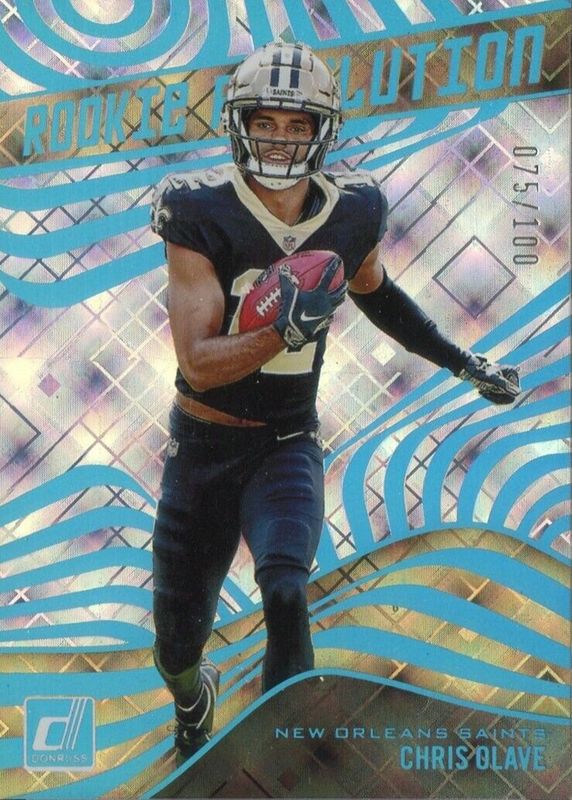 The Chris Olave 2022 Donruss #REV-9 Rookie Revolution - Cosmic /100 card in Raw condition has not changed in price in the last 30 days and was last sold for $1.53 .