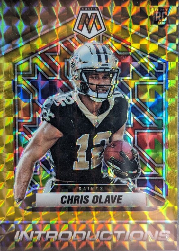 The Chris Olave 2022 Mosaic #I-7 Introductions - Gold /10 Rookie card in Raw condition has not changed in price in the last 30 days and was last sold for $30.00 .