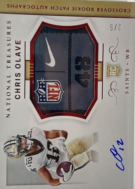 The Chris Olave 2022 National Treasures #CRPA-CO Crossover Rookie Patch Autographs - Laundry Tag /5 card in Raw condition has not changed in price in the last 30 days and was last sold for $260.00 .