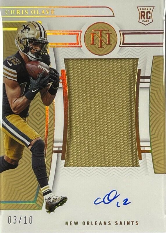 The Chris Olave 2022 National Treasures #167 Rookie Patch Auto - Holo Gold /10 card in Raw condition has not changed in price in the last 30 days and was last sold for $192.50 .