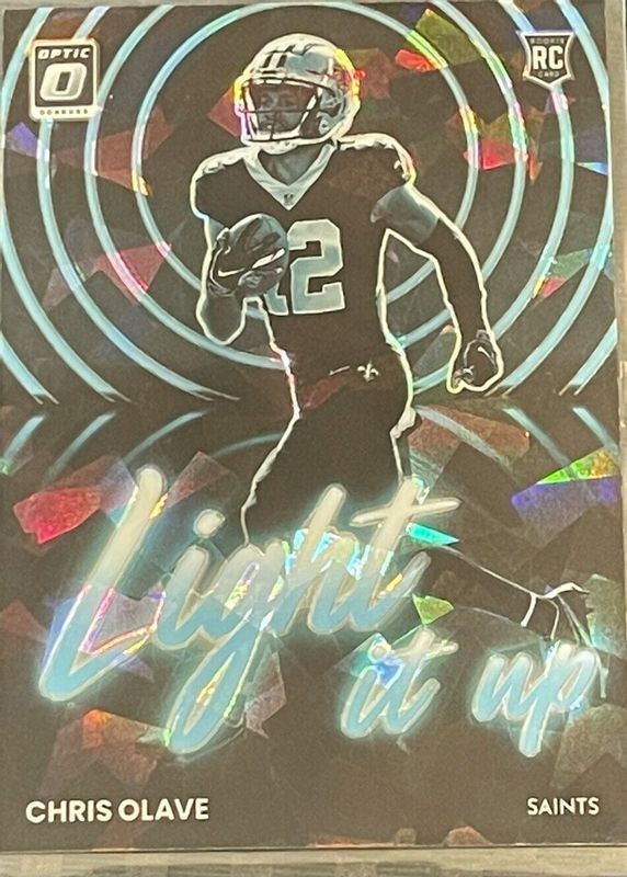 The Chris Olave 2022 Optic #LU-13 Light It Up - Ice /15 Rookie card in Raw condition has not changed in price in the last 30 days and was last sold for $39.99 .