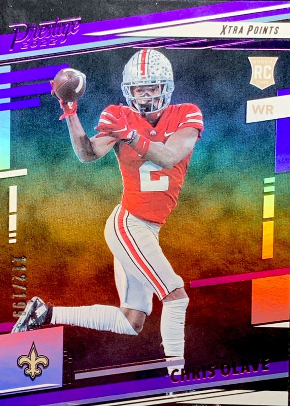 The Chris Olave 2022 Prestige #310 Xtra Points Premium Purple /199 Rookie card in Raw condition has not changed in price in the last 30 days and was last sold for $5.00 .