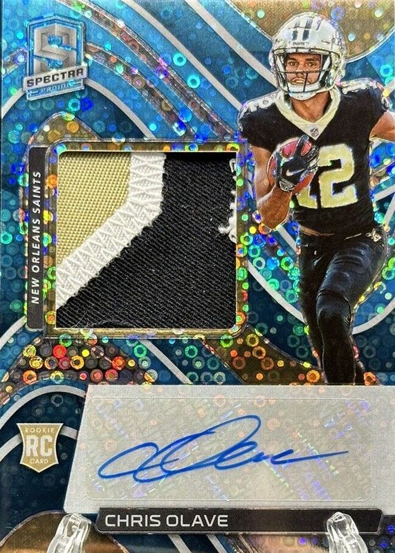 The Chris Olave 2022 Spectra #206 Rookie Patch Auto - Neon Blue /60 card in Raw condition has not changed in price in the last 30 days and was last sold for $90.00 .