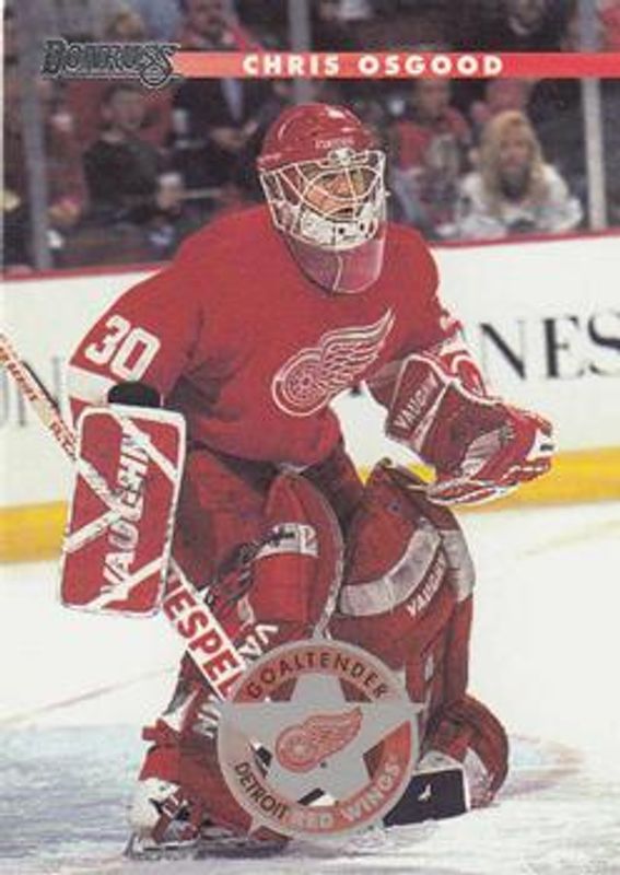 The Chris Osgood 1996 Donruss #95 Base card is 1 of 3 Chris Osgood's card variations in the 1996 Donruss set being tracked by Sports Card Investor, including Press Proofs, and Between The Pipes /4000.