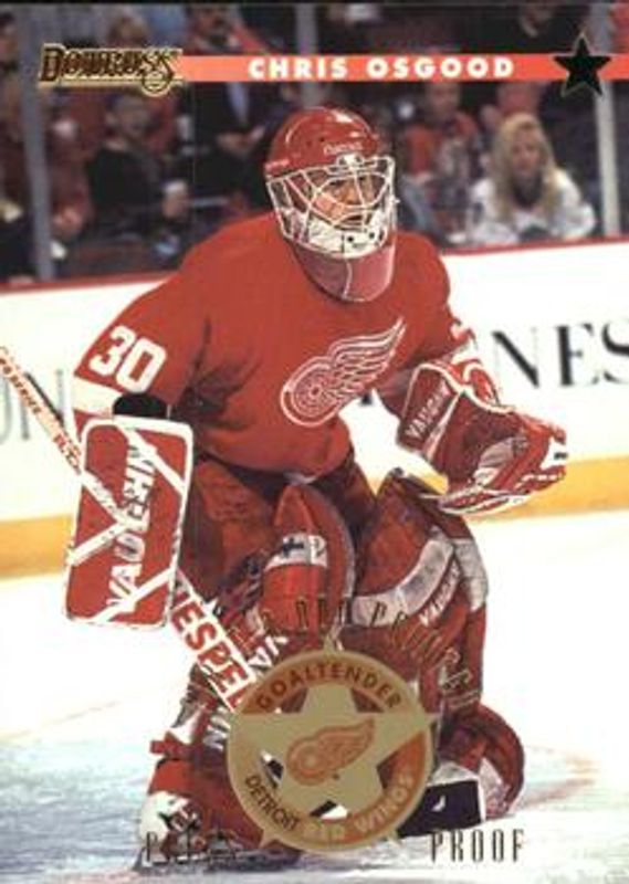 The Chris Osgood 1996 Donruss #95 Press Proofs card is 1 of 3 Chris Osgood's card variations in the 1996 Donruss set being tracked by Sports Card Investor, including Base, and Between The Pipes /4000.