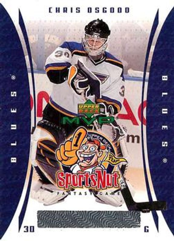 The Chris Osgood 2003 Upper Deck MVP #SN75 SportsNut card is 1 of 6 Chris Osgood's card variations in the 2003 Upper Deck MVP set being tracked by Sports Card Investor, including Base, Silver Script /150, Gold Script /25, Red Script /25, and Threads Of Change /100.