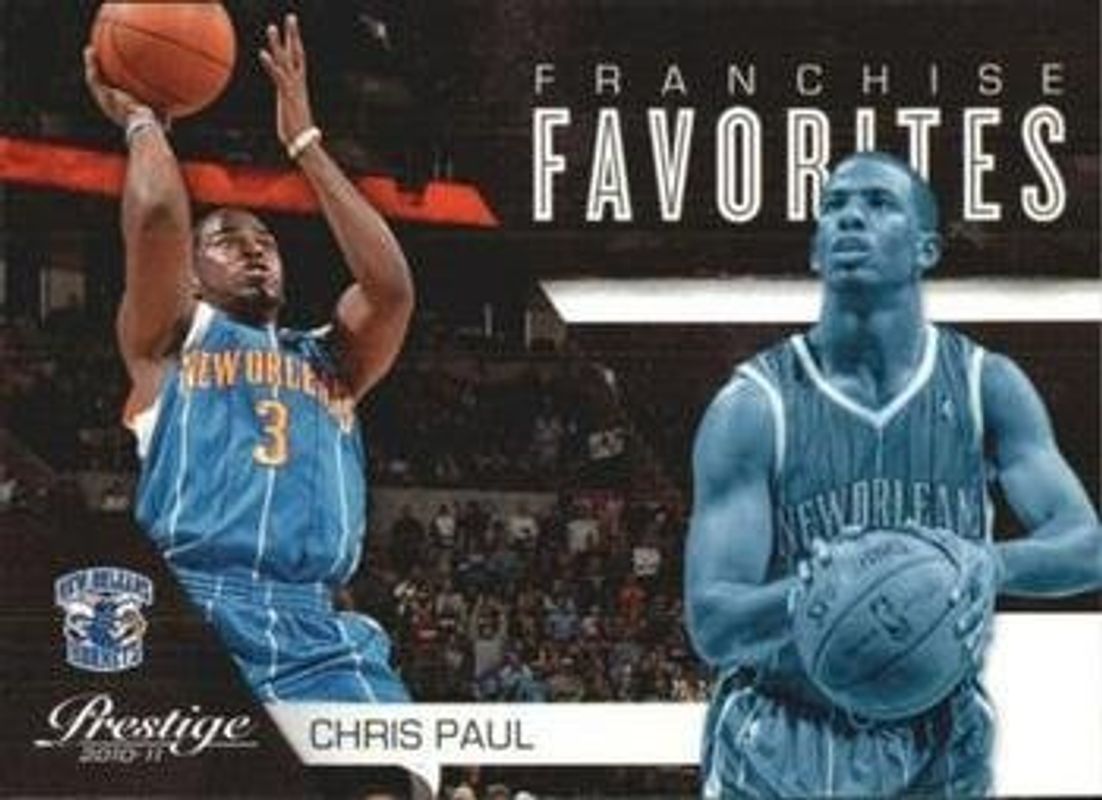 The Chris Paul 2010 Prestige #19 Franchise Favorites card is 1 of 17 Chris Paul's card variations in the 2010 Prestige set being tracked by Sports Card Investor, including Bonus Shots Orange /499, Bonus Shots Gold /249, Bonus Shots Purple /49, Bonus Shots Green /25, and Bonus Shots Black /10.