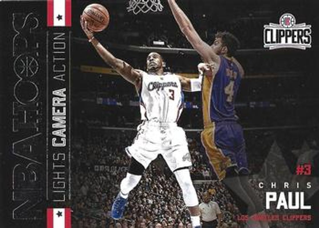 The Chris Paul 2015 Hoops #13 Lights...Camera...Action! card is 1 of 21 Chris Paul's card variations in the 2015 Hoops set being tracked by Sports Card Investor, including Base, Gold, Green, Red Back, and Blue /399.