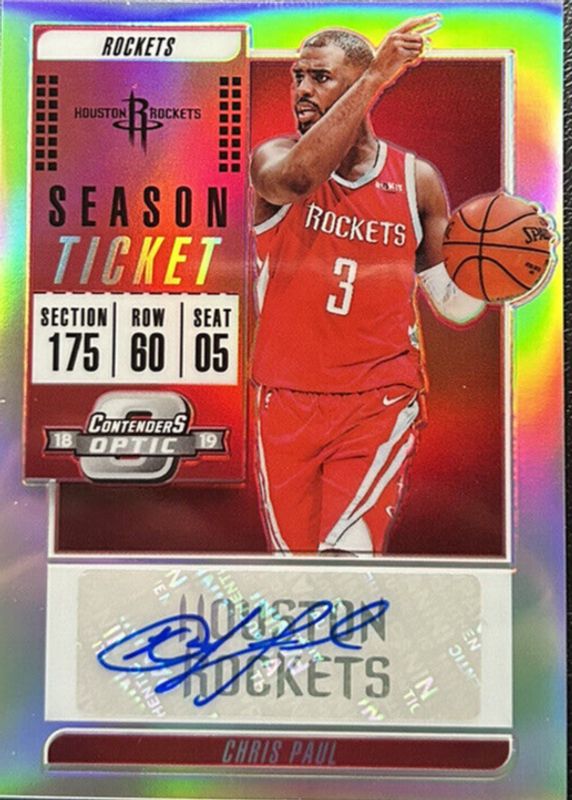 This card is 1 of 6 Chris Paul's card variations in the 2018 Contenders Optic set being tracked by Sports Card Investor, including Veteran Season Ticket Autographs - Red /49, Veteran Season Ticket Autographs - Blue /35, Veteran Season Ticket Autographs - Orange /25, Veteran Season Ticket Autographs - Gold /10, and Veteran Season Ticket Autographs - Gold Vinyl /1.
