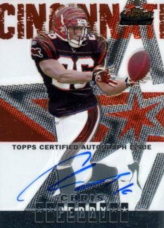 The Chris Perry 2004 Topps Finest #120 Base /399 Rookie card is 1 of 8 Chris Perry's card variations in the 2004 Topps Finest set being tracked by Sports Card Investor, including Refractors /199, Gold Refractor /50, X-Fractor /5, Printing Plate Black /1, and Printing Plate Cyan /1.