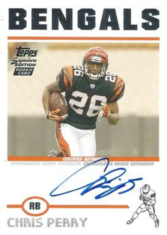 The Chris Perry 2004 Topps Signature #76 Base /499 Rookie card is 1 of 3 Chris Perry's card variations in the 2004 Topps Signature set being tracked by Sports Card Investor, including Blue /50, and Gold /1.