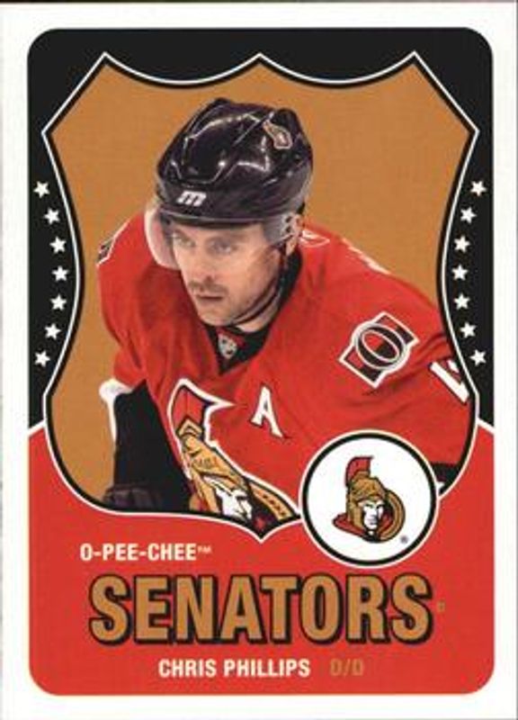 The Chris Phillips 2010 O-Pee-Chee Retro Blank Back card is 1 of 5 Chris Phillips' card variations in the 2010 O-Pee-Chee set being tracked by Sports Card Investor, including Base, Retro, Retro Rainbow, and Retro Black Rainbow /100.