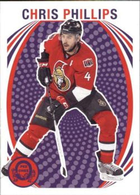The Chris Phillips 2013 O-Pee-Chee #189 Retro card is 1 of 6 Chris Phillips' card variations in the 2013 O-Pee-Chee set being tracked by Sports Card Investor, including Base, Rainbow, Red, Retro Blank Back, and Black Rainbow /100.