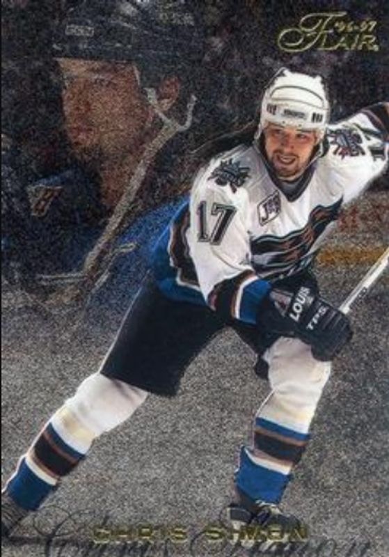 The Chris Simon 1996 Flair #100 Base card is 1 of 2 Chris Simon's card variations in the 1996 Flair set being tracked by Sports Card Investor, including Blue Ice Collection /250.