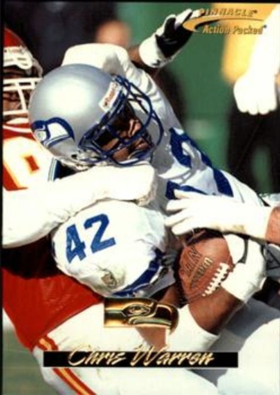 The Chris Warren 1996 Action Packed Flagship #71 Base card is 1 of 3 Chris Warren's card variations in the 1996 Action Packed Flagship set being tracked by Sports Card Investor, including Artist's Proofs, and Ball Hog.