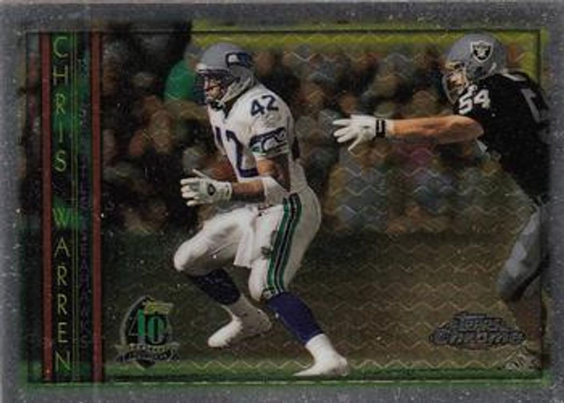The Chris Warren 1996 Topps Chrome #65 Base card is 1 of 6 Chris Warren's card variations in the 1996 Topps Chrome set being tracked by Sports Card Investor, including #53 Base, #53 Refractor, #65 Refractor, #21 40th Anniversary Retros, and #21 40th Anniversary Retros - Refractor.