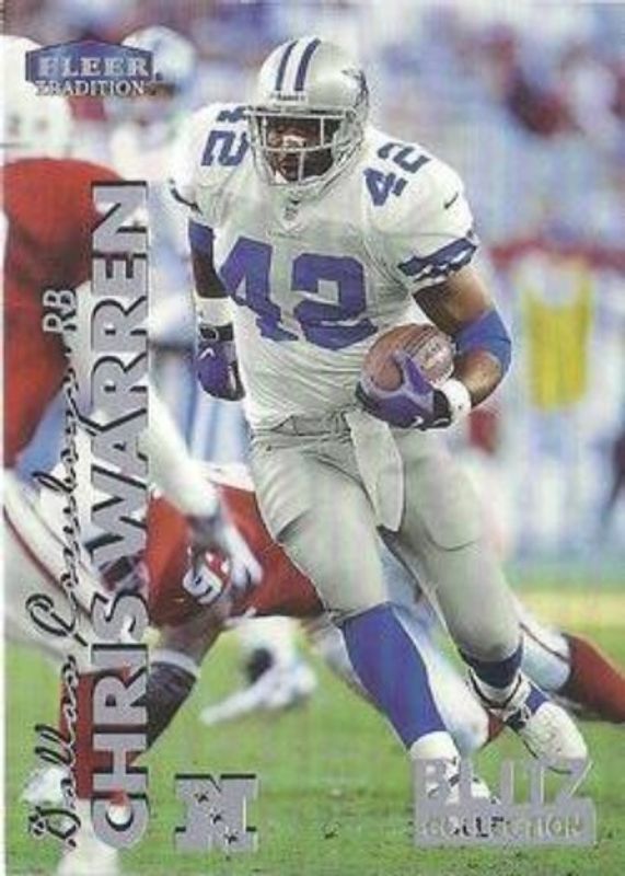 The Chris Warren 1999 Fleer Tradition #145BC Blitz Collection card is 1 of 3 Chris Warren's card variations in the 1999 Fleer Tradition set being tracked by Sports Card Investor, including Base, and Trophy Collection /20.