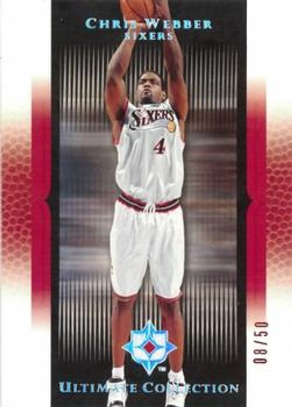 The Chris Webber 2005 Upper Deck Ultimate Collection #98 Red /50 card is 1 of 4 Chris Webber's card variations in the 2005 Upper Deck Ultimate Collection set being tracked by Sports Card Investor, including Base /750, Blue /125, and Silver /25.