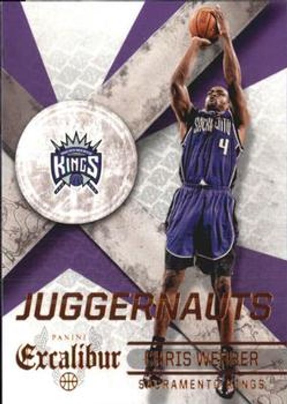 The Chris Webber 2014 Excalibur #24 Juggernauts card is 1 of 8 Chris Webber's card variations in the 2014 Excalibur set being tracked by Sports Card Investor, including High Praise, Juggernauts - Blue /99, Juggernauts - Orange /99, Kaboom! /(SSP), and Juggernauts - Silver /49.