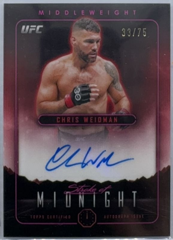 The Chris Weidman 2024 Topps Midnight UFC #SMA-CWN Stroke of Midnight Autographs - Twilight /75 card is 1 of 7 Chris Weidman's card variations in the 2024 Topps Midnight UFC set being tracked by Sports Card Investor, including Stroke of Midnight Autographs, Stroke of Midnight Autographs - Moon Beam, Stroke of Midnight Autographs - Moonrise /25, Stroke of Midnight Autographs - Midnight /12, and Stroke of Midnight Autographs Day Break /5.