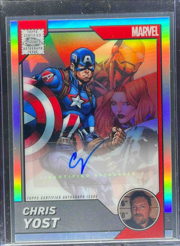 The Chris Yost 2025 Topps Chrome #AA-CY Marvel Comic Book Artist & Writer Autographs card is 1 of 9 Chris Yost's card variations in the 2025 Topps Chrome set being tracked by Sports Card Investor, including Marvel Comic Book Artist & Writer Autographs - Iron Man Red & Gold Lazer Refractor /100, Marvel Comic Book Artist & Writer Autographs - Hulk Green Lazer Refractor /99, Marvel Comic Book Artist & Writer Autographs - Purple Shimmer Refractor /75, Marvel Comic Book Artist & Writer Autographs - Gold Wave Refractor /50, and Marvel Comic Book Artist & Writer Autographs - Orange Refractor /25.