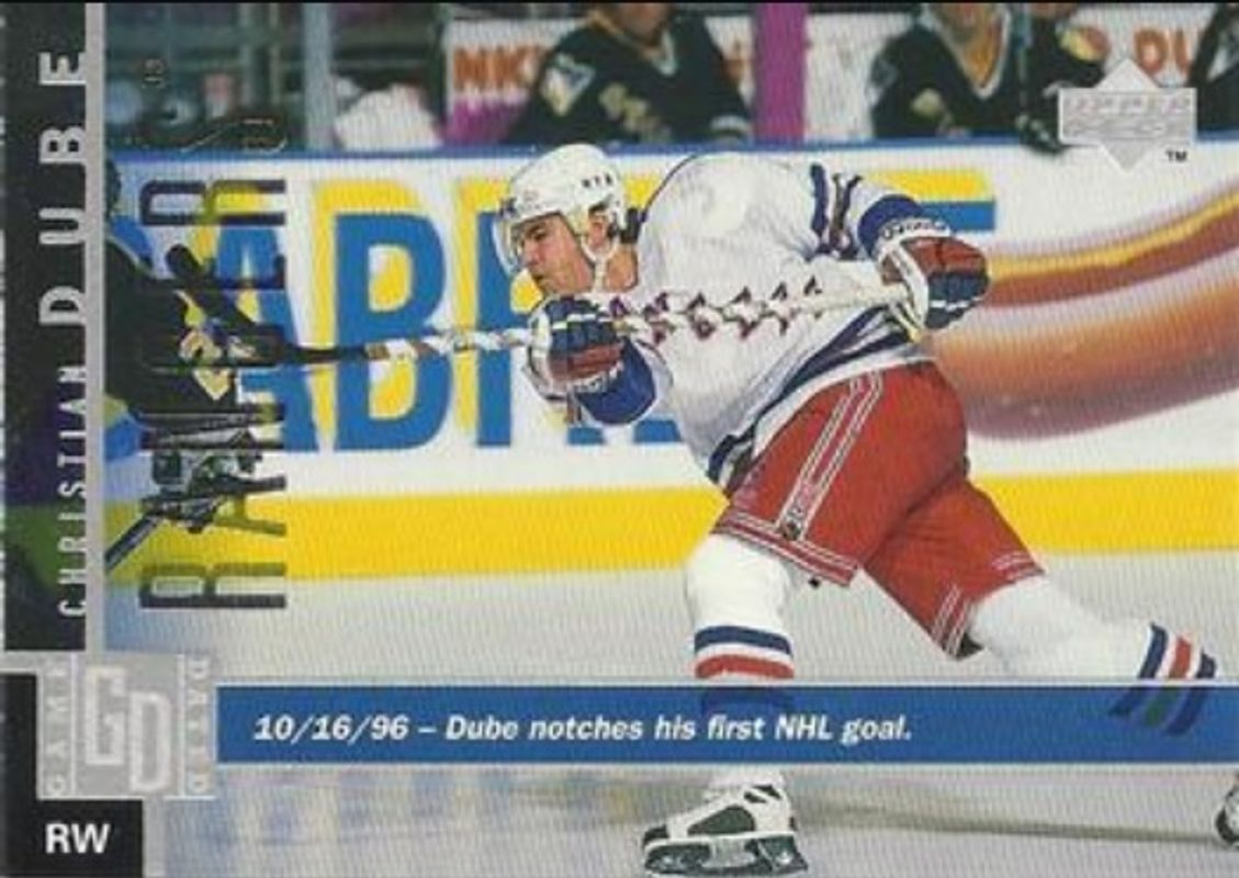 The Christian Dube 1997 Upper Deck #105 Base card is 1 of 2 Christian Dube's card variations in the 1997 Upper Deck set being tracked by Sports Card Investor, including Game Dated.