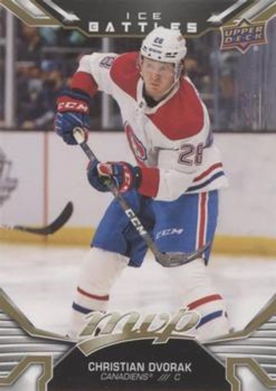 The Christian Dvorak 2022 Upper Deck MVP #106 Ice Battles - Gold card is 1 of 13 Christian Dvorak's card variations in the 2022 Upper Deck MVP set being tracked by Sports Card Investor, including Base, Blue Script, Gold Script, Ice Battles, and Silver Script.