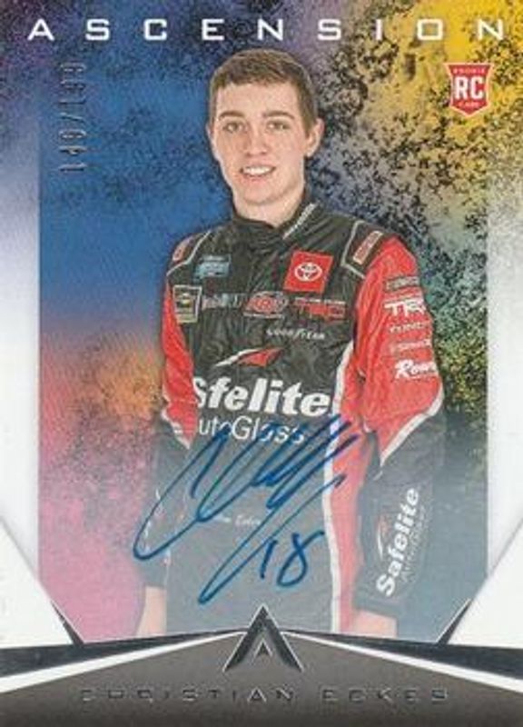 The Christian Eckes 2020 Chronicles NASCAR #9 Ascension Autographs /199 card is 1 of 16 Christian Eckes' card variations in the 2020 Chronicles NASCAR set being tracked by Sports Card Investor, including Ascension, Spectra, Ascension Blue /199, Ascension Red /99, and Spectra Neon Green Kaleidoscope /49.