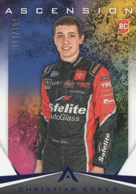 The Christian Eckes 2020 Chronicles NASCAR #9 Ascension Blue /199 card is 1 of 16 Christian Eckes' card variations in the 2020 Chronicles NASCAR set being tracked by Sports Card Investor, including Ascension, Spectra, Ascension Autographs /199, Ascension Red /99, and Spectra Neon Green Kaleidoscope /49.