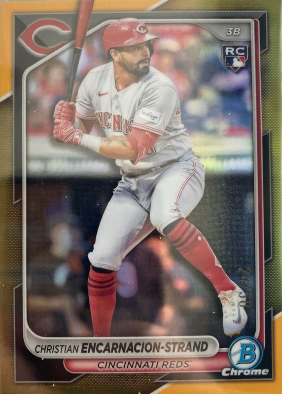 The Christian Encarnacion-Strand 2024 Bowman Chrome #91 Gold Refractor /50 Rookie card in Raw condition has not changed in price in the last 30 days and was last sold for $10.00 .