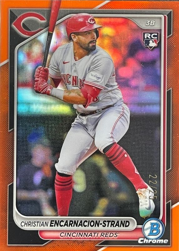 The Christian Encarnacion-Strand 2024 Bowman Chrome #91 Orange Refractor /25 Rookie card in Raw condition has not changed in price in the last 30 days and was last sold for $12.00 .
