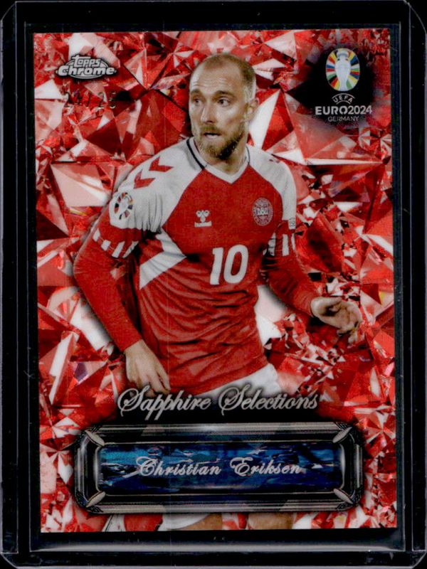 The Christian Eriksen 2024 Topps Chrome Sapphire Edition UEFA Euro #SS-2 Sapphire Selections - Orange /25 card is 1 of 12 Christian Eriksen's card variations in the 2024 Topps Chrome Sapphire Edition UEFA Euro set being tracked by Sports Card Investor, including Chrome, Sapphire Selections, Chrome - Gold /50, Sapphire Selections - Gold /50, and Chrome - Orange /25.